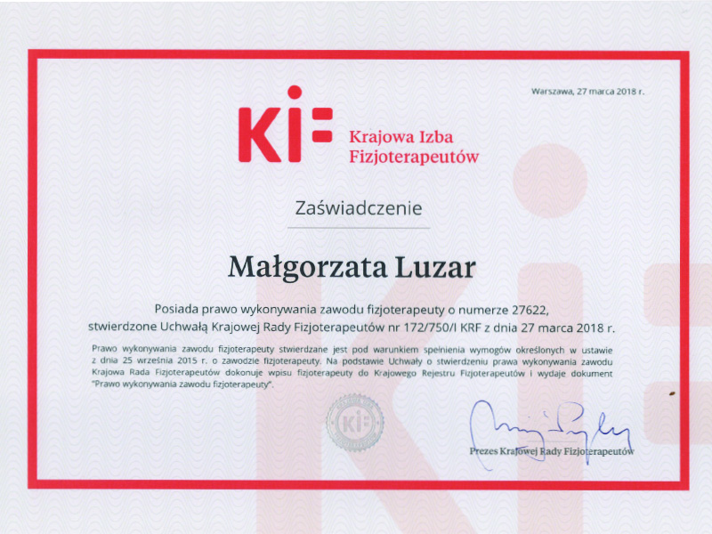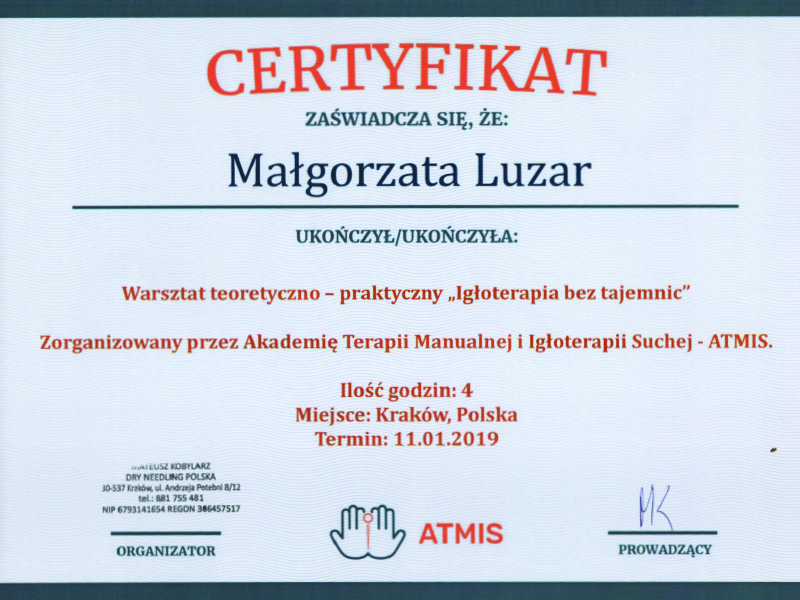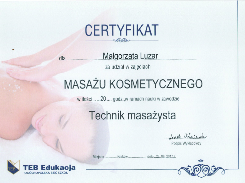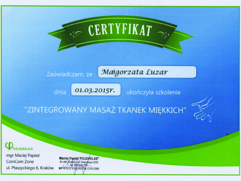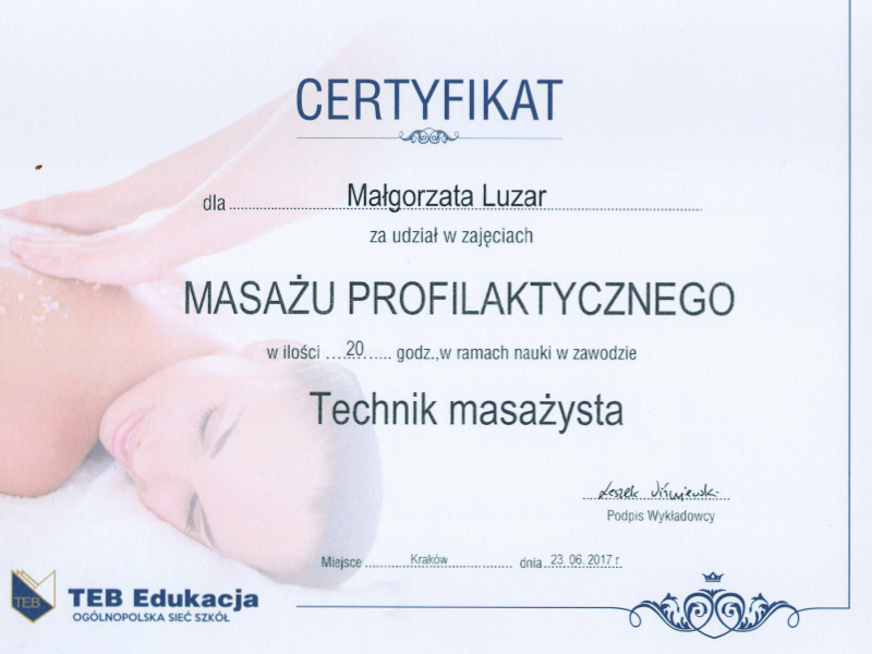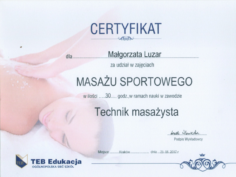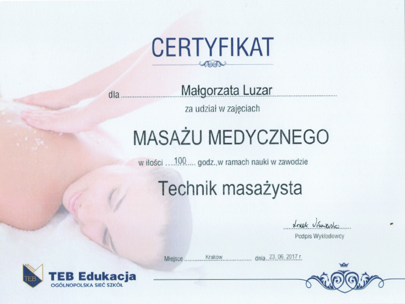 Nazywam się Małgorzata Luzar-Ogar, jestem doświadczoną fizjoterapeutką, a także masażystką z wieloletnim stażem. Swoje kwalifikacje zdobyłam na Akademii Wychowania Fizycznego w Krakowie, a także w policealnej szkole masażu. Pracę z pacjentami rozpoczęłam już w trakcie studiów, gdzie swoje doświadczenie zdobyłam dzięki wielu praktykom odbytym zarówno w szpitalach na różnych oddziałach jak i w prywatnych gabinetach fizjoterapeutycznych oraz salonach odnowy biologicznej i SPA. Kończąc studia w dalszym ciągu się rozwijałam poprzez uczestnictwo w szkoleniach, kursach oraz konferencjach. Przez lata praktyki oraz współpracy z wspaniałymi i doświadczonymi ludźmi zdobywałam coraz to nowsze cenne doświadczenie, wiedzę i umiejętności w zakresie fizjoterapii, masażu, odnowy biologicznej, pracy ze sportowcami a także masażu biurowego (work-site).