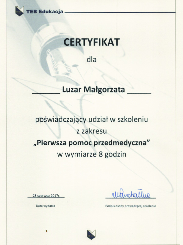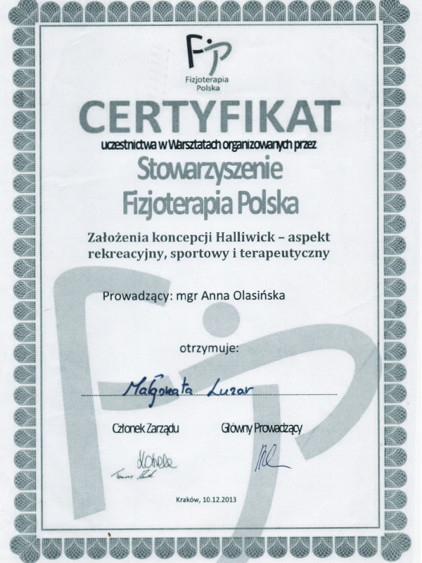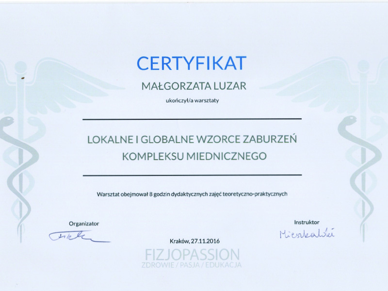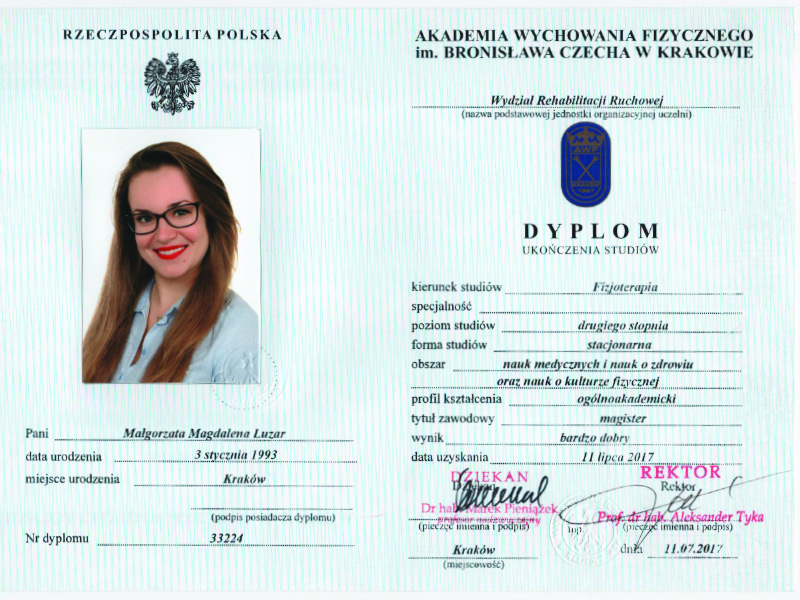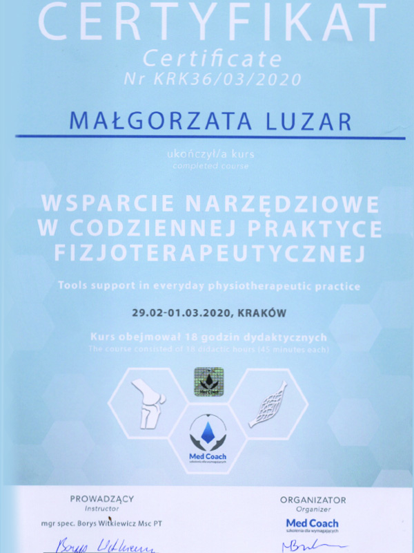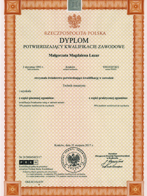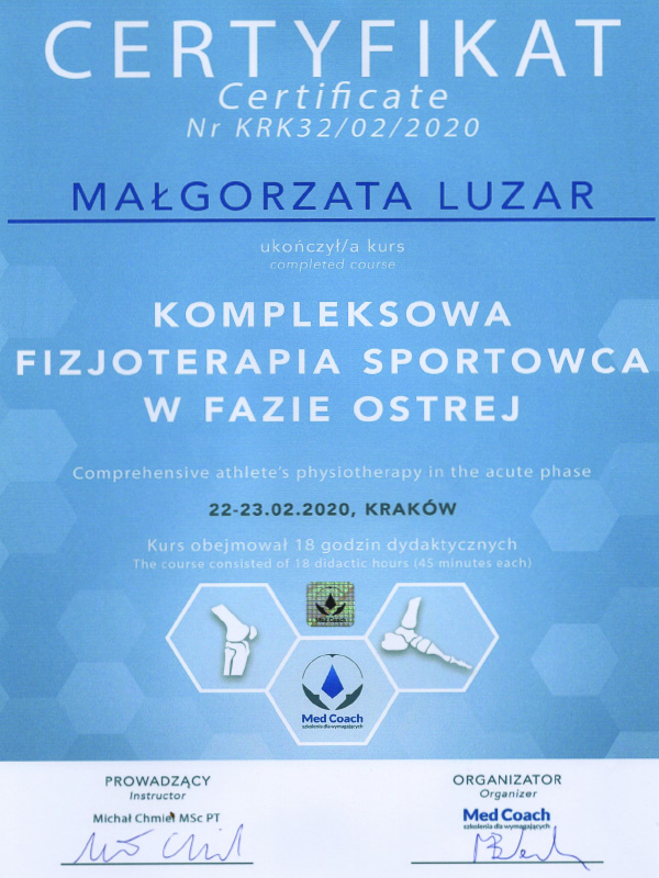 Nazywam się Małgorzata Luzar-Ogar, jestem doświadczoną fizjoterapeutką, a także masażystką z wieloletnim stażem. Swoje kwalifikacje zdobyłam na Akademii Wychowania Fizycznego w Krakowie, a także w policealnej szkole masażu. Pracę z pacjentami rozpoczęłam już w trakcie studiów, gdzie swoje doświadczenie zdobyłam dzięki wielu praktykom odbytym zarówno w szpitalach na różnych oddziałach jak i w prywatnych gabinetach fizjoterapeutycznych oraz salonach odnowy biologicznej i SPA. Kończąc studia w dalszym ciągu się rozwijałam poprzez uczestnictwo w szkoleniach, kursach oraz konferencjach. Przez lata praktyki oraz współpracy z wspaniałymi i doświadczonymi ludźmi zdobywałam coraz to nowsze cenne doświadczenie, wiedzę i umiejętności w zakresie fizjoterapii, masażu, odnowy biologicznej, pracy ze sportowcami a także masażu biurowego (work-site).