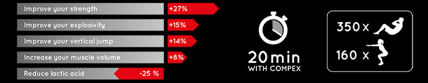 Trening z elektrostymulatorem Compex pomaga zmaksymalizować wysiłek mięśniowy, angażując większy procent włókien mięśniowych. Compex może celować zarówno w wolnokurczliwe włókna mięśniowe typu 1, które wpływają na wytrzymałość, jak i do szybkokurczliwych włókien mięśniowych typu 2 z siłą uderzenia i dynamiką. Compex może pomóc zwiększyć efektywność treningu, umożliwiając lepsze wyniki w zakresie sprawności.